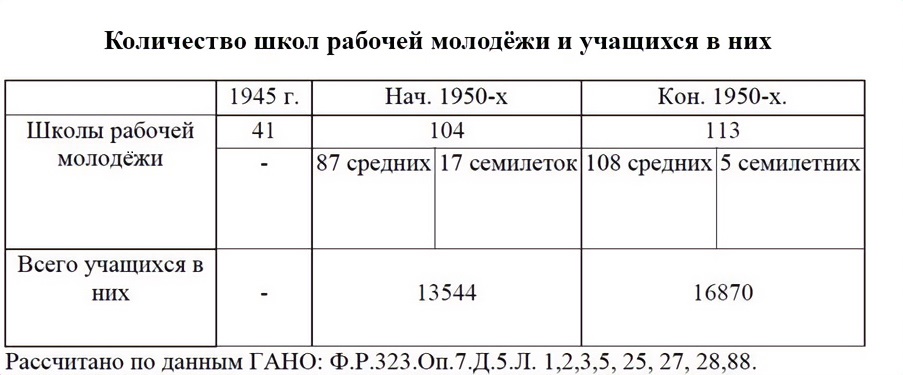 Как видно из таблицы, число учащихся школ этого типа непрерывно возрастало. Увеличение контингента ШРМ шло за счёт увеличения набора в 8–10 классы, который в середине 1950-х гг. составлял 9289 человек, а к концу 1950-х гг. – уже 12332 человек. Большое значение имела работа областной заочной средней школы, в которой только за 1955–1956 гг. было обучено почти 2 тыс. человек.