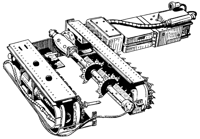 Угольный комбайн «Донбасс». Справа — кольцевой бар с режущей цепью и диски для дробления угля; слева — кольцевой погрузчик.