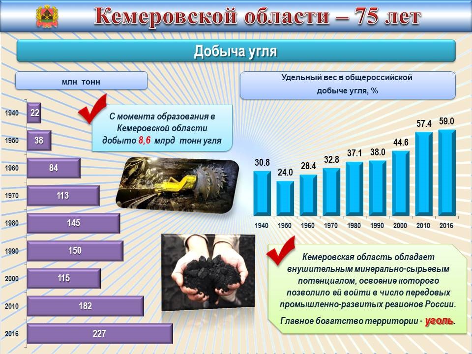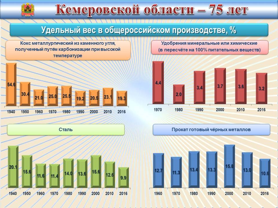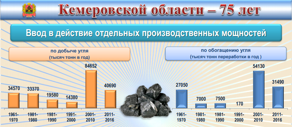 В 1961–1975 гг. промышленная мощность Кузбасса увеличилась в 2,6 раза, угольная добыча – в 1,6 раза, чёрная металлургия в – 3,8 раза, химическая промышленность – в 4,6 раза, машиностроение и металлообработка – в 3,9 раза, производство электроэнергии в – 2,8 раза, цемента и металлоконструкций – в 2,8 раза.
