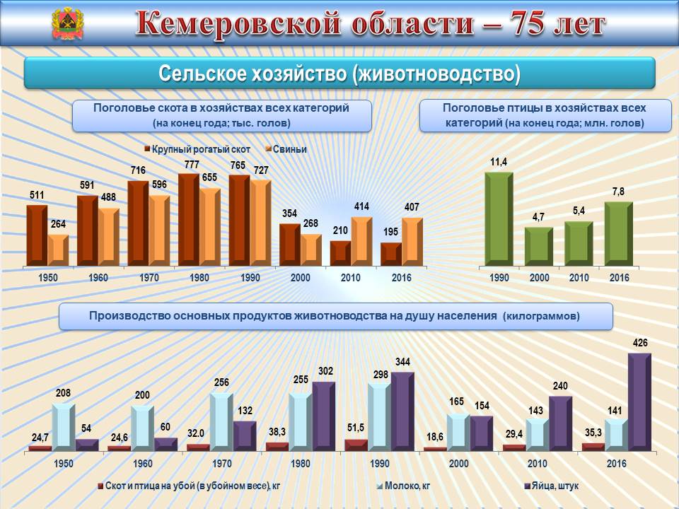 К началу 1950-х гг. сельское хозяйство Кузбасса смогло достигнуть лишь довоенного уровня. В 1953 г. посевные площади составляли чуть более 1 млн га. После ХХ съезда партии (1956 г.) начался рост капиталовложений, повышались закупочные цены, увеличивалось количество техники. Сельское хозяйство послевоенного Кузбасса получило овоще-картофелеводческое и мясо-молочное направление. В Кузбассе в 1950-е гг. было сосредоточено до 20 % производства картофеля, 25 % посевов овощей и до 15 % мяса и яиц, производимых в Западной Сибири. За счёт расширения посевных площадей и увеличения количества техники выросли урожаи. Капиталовложения помогли увеличить поголовье скота, производство мяса, молока и яиц.