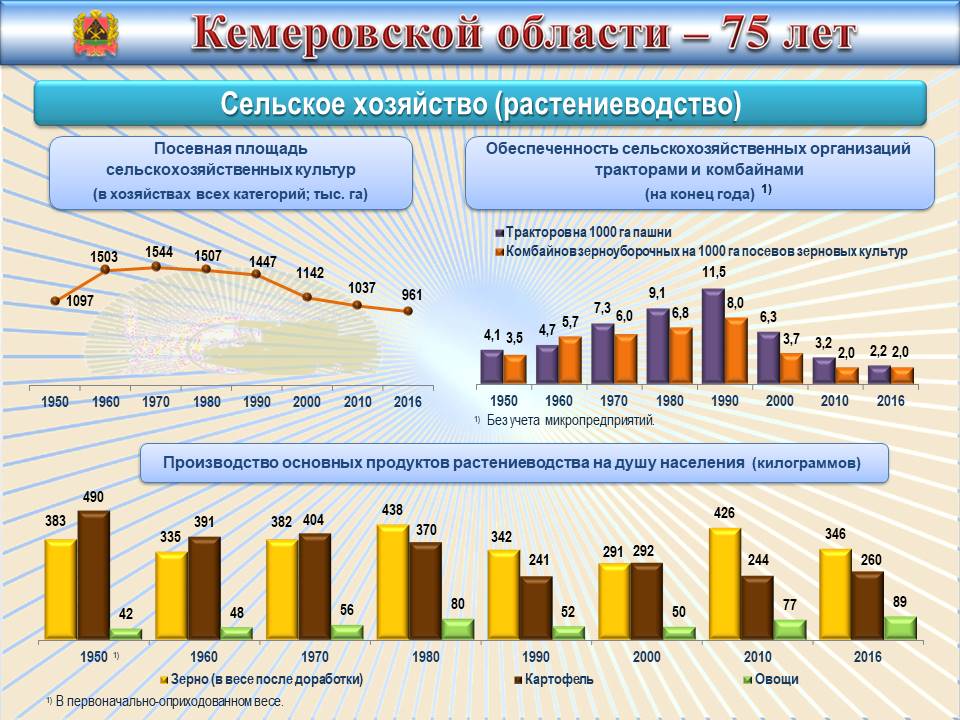 Среднегодовой валовый сбор зерновых в 1975 г. достиг 1270 тыс. т, а картофеля – 1301 тыс. т. В 1970-е гг. прогрессивные агрономы вводили новые способы обработки почты (безотвальная обработка почвы) с целью повышения урожая. Агроном совхоза «Заря» (Промышленновского района) А.А. Бондарев, применяя новую технику обработки земли на экспериментальном поле в 60 га, смог добиться повышения урожая до 25 центнеров с гектара.